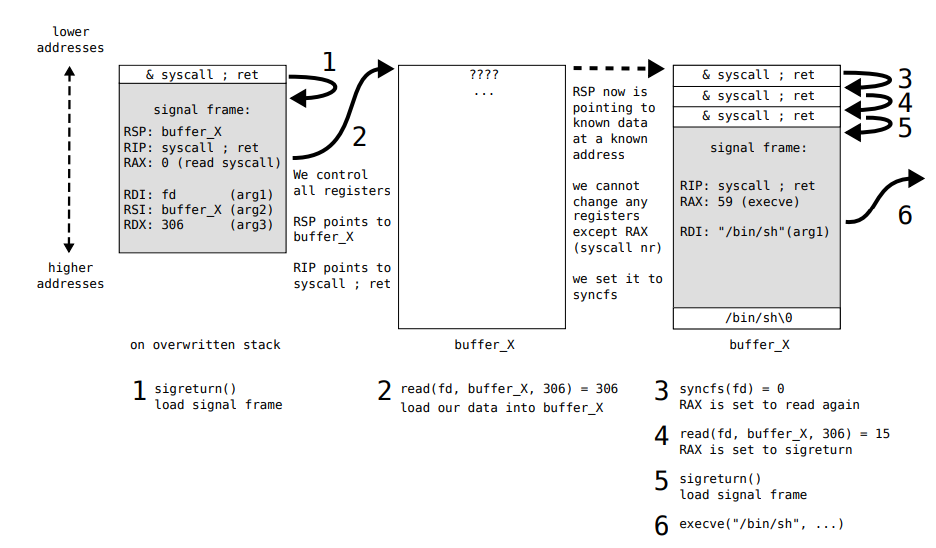 SROP(S for Sigreturn)技术在2014年被提出,论文原文在https://www.cs.vu.nl/~herbertb/papers/srop_sp14.pdf