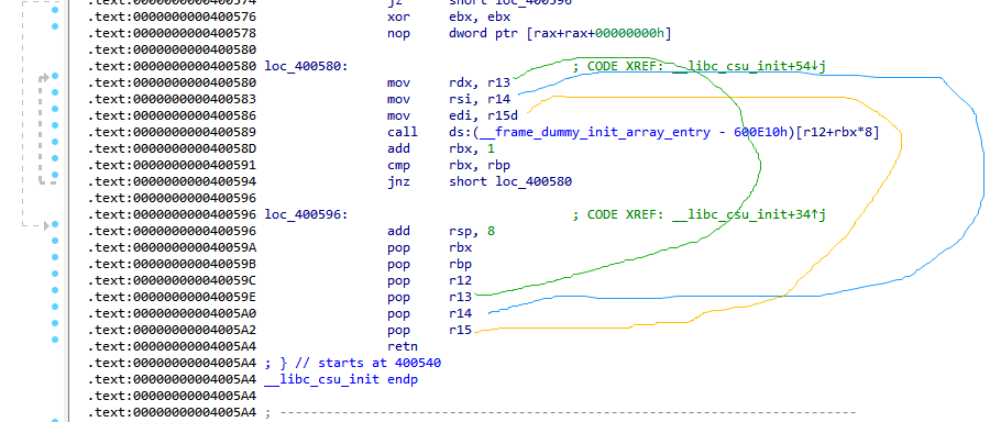 可以是ret2csu,简单来说就是比如,下图,高地址可以控制r13,那么我们可以跳回mov rdx,r13,从而控制rdx,外加一次泄露栈地址即可让edi受控为binsh,此处不赘述