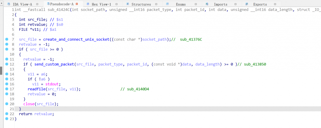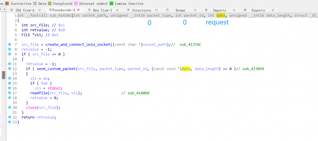 对xmldbc_ephp逆向工程如下,其主要函数sub_41424C的作用是,通过UNIX套接字与一个XML数据库守护进程进行通信,