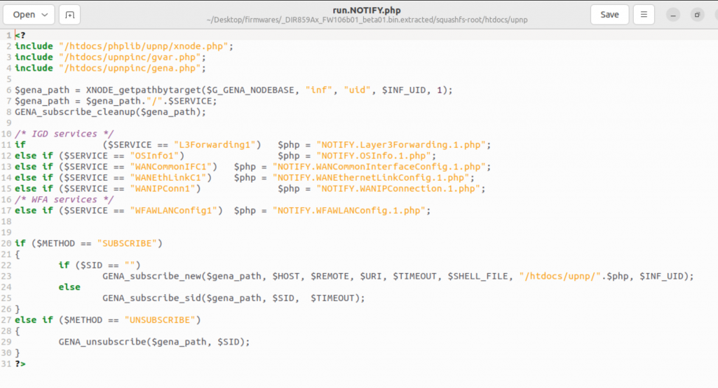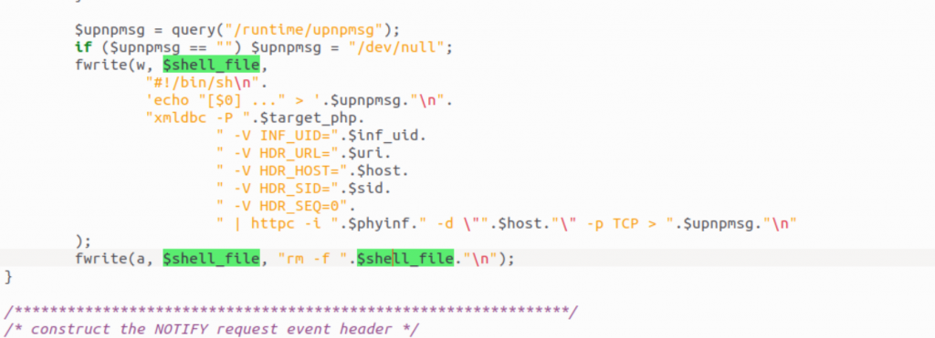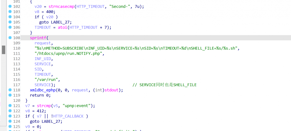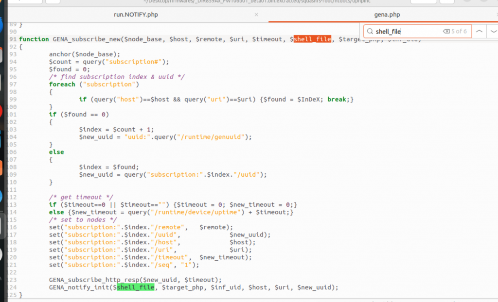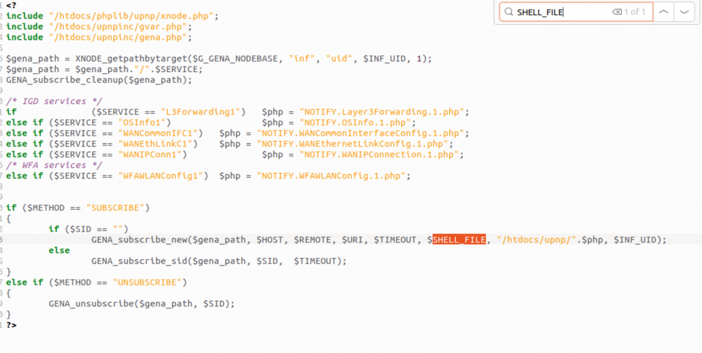 前文提到,提交了一个.sh文件,跟进/htdocs/upnp/run.NOTIFY.php看看有没有机会代码执行,重点关注SHELL_FILE