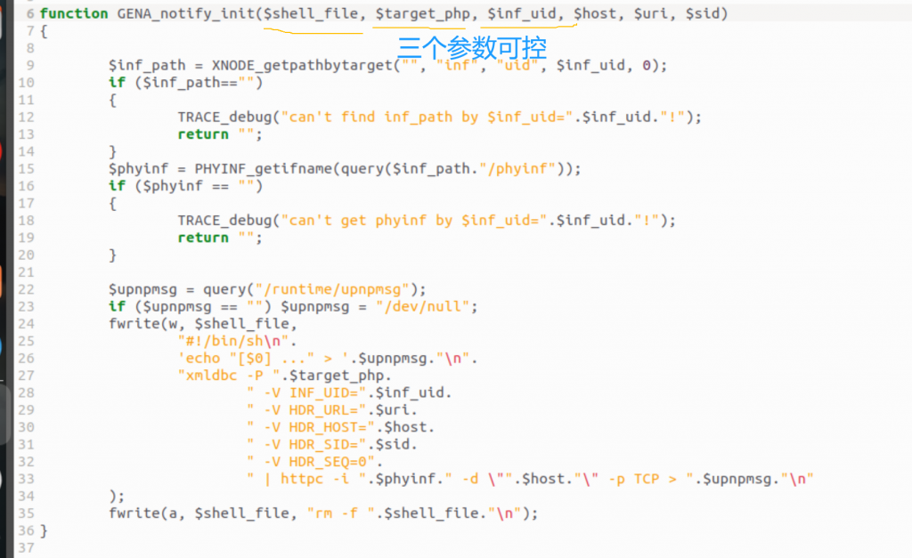 再跟进GENA_notify_init,其参数$shell_file, $target_php, $inf_uid都仍然受到用户的控制