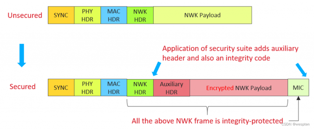 zigbee很早就考虑到了传输安全问题,使用AES128的加密传输措施以及CCM模式认证,对网络层的payload进行加密传输,数据帧的封装情况如下