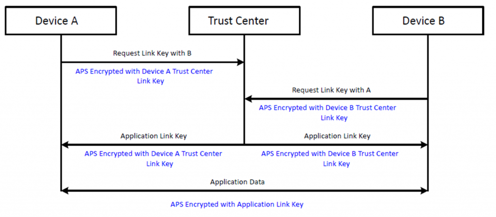 LinkKey链接密钥,如果节点之间希望进行通信,则节点需要向信任中心请求一个链接密钥,用来保证端到端的安全