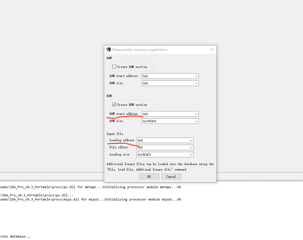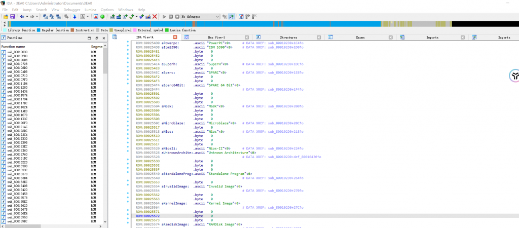 假设填写此处加载地址、rom起始地址为默认的0x0,就会这样,很多代码片段的分析出现了引用区域的错误,进而导致ida认为这并不是代码段