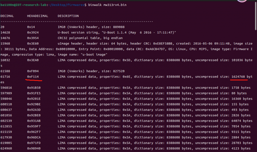 可以看到,vxworks后面有好多个LZMA的压缩文件,会直接使用内存的位置来命名文件,binwalk无法去恢复其文件系统的结构和文件名(即使这里面有个jffs2文件系统)。不过这没关系,实际上有一个最大的文件,叫做F114,网上的教程一般就是取出最大的那个二进制文件去分析,这部分一般包含着主要逻辑