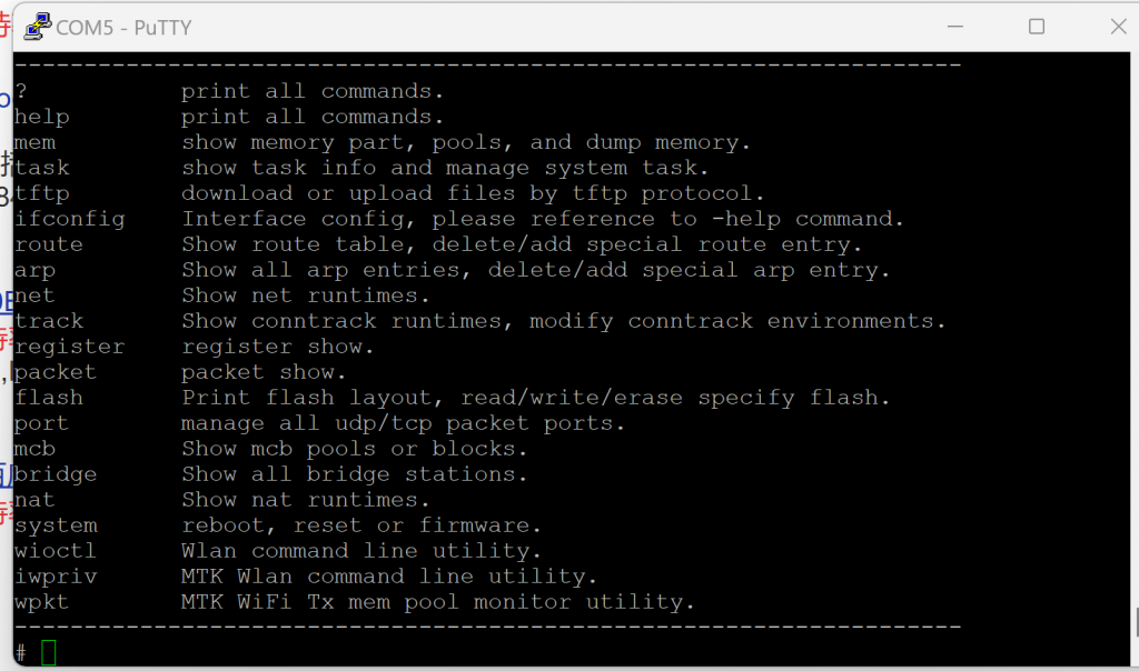 进入U-Boot成功,可惜是个阉割shell,不过有mem的dump功能,也有tftp传出指定内存区域的功能,甚至还能查看内存分配区域