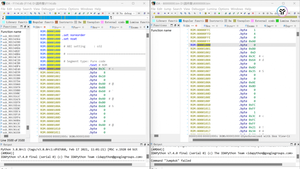 (p.s. IDA 7.x版本需要划定一部分区域然后按c->force转成代码,而IDA 8.3会先对整个文件进行是否为代码的扫描所以不用)