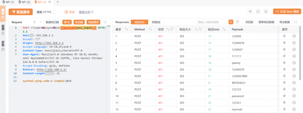 但是我们密码算法就能直接往id提交参数,如果错误了,还会像之前一样返回401,并且附带拼接到密码算法上的一些值(authInfo[3]和authInfo[4]分别对应右边返回的第11行和第12行)